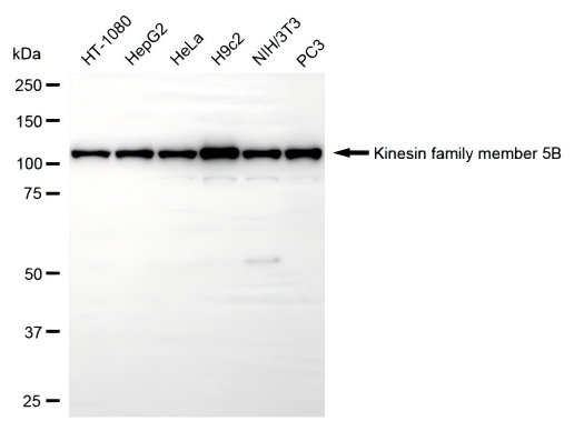 Western blotting analysis using kinesin family member 5B antibody. Total cell lysates (30 μg) from various cell lines were loaded and separated by SDS-PAGE. The blot was incubated with kinesin family member 5B antibody and HRP-conjugated goat anti-rabbit secondary antibody respectively.