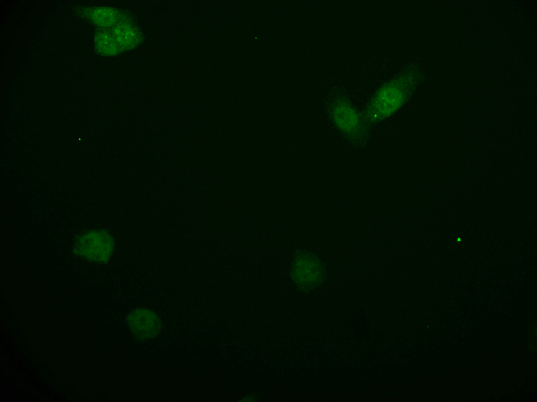Immunofluorescence staining of PC-3 cell with CSB-RA869779A0HU at 1:50, counter-stained with DAPI. The cells were fixed in 4% formaldehyde and blocked in 10% normal Goat Serum. The cells were then incubated with the antibody overnight at 4°C. The secondary antibody was Alexa Fluor 552-congugated AffiniPure Goat Anti-Rabbit IgG(H+L).