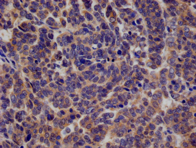 IHC image of CSB-RA869779A0HU diluted at 1:100 and staining in paraffin-embedded human ovarian cancer performed on a Leica BondTM system. After dewaxing and hydration, antigen retrieval was mediated by high pressure in a citrate buffer (pH 6.0). Section was blocked with 10% normal goat serum 30min at RT. Then primary antibody (1% BSA) was incubated at 4°C overnight. The primary is detected by a Goat anti-rabbit polymer IgG labeled by HRP and visualized using 0.05% DAB.