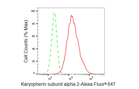 Flow cytometric analysis of Karyopherin subunit alpha 2 expression in HepG2 cells using Karyopherin subunit alpha 2 antibody. Green, isotype control; red, Karyopherin subunit alpha 2.