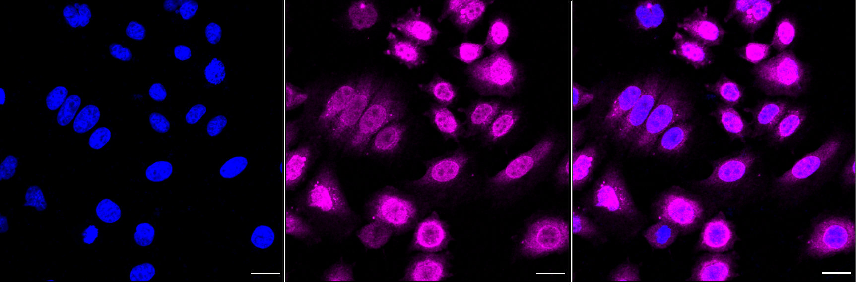 Immunocytochemical staining of HepG2 cells with Karyopherin subunit alpha 2 antibody. Nuclei were stained blue with DAPI; Karyopherin subunit alpha 2 was stained magenta with Alexa Fluor? 647. Images were taken using Leica stellaris 5. Protein abundance based on laser Intensity and smart gain: High. Scale bar, 20 μm.