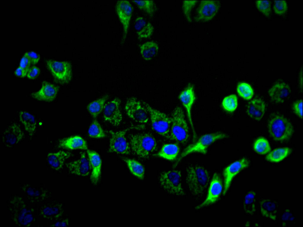 Immunofluorescence staining of Hela cell with CSB-RA914278A0HU at 1:50, counter-stained with DAPI. The cells were fixed in 4% formaldehyde, permeabilized using 0.2% Triton X-100 and blocked in 10% normal Goat Serum. The cells were then incubated with the antibody overnight at 4°C. The secondary antibody was Alexa Fluor 488-congugated AffiniPure Goat Anti-Rabbit IgG(H+L).