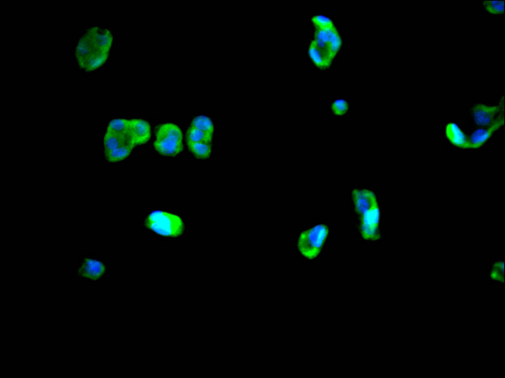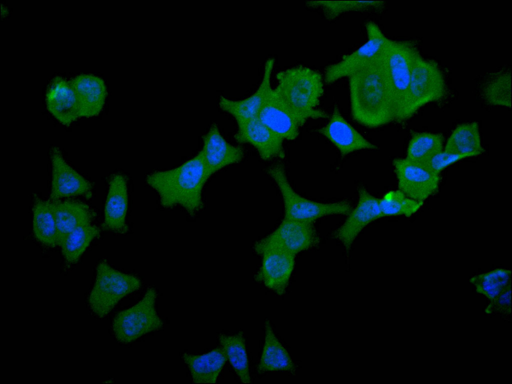 Immunofluorescence staining of HepG2 cell with CSB-RA012519MA1HU at 1:30 ,counter-stained with DAPI. The cells were fixed in 4% formaldehyde, permeabilized using 0.2% Triton X-100 and blocked in 10% normal Goat Serum. The cells were then incubated with the antibody overnight at 4°C. The secondary antibody was Alexa Fluor 488-congugated AffiniPure Goat Anti-Human IgG(H+L).