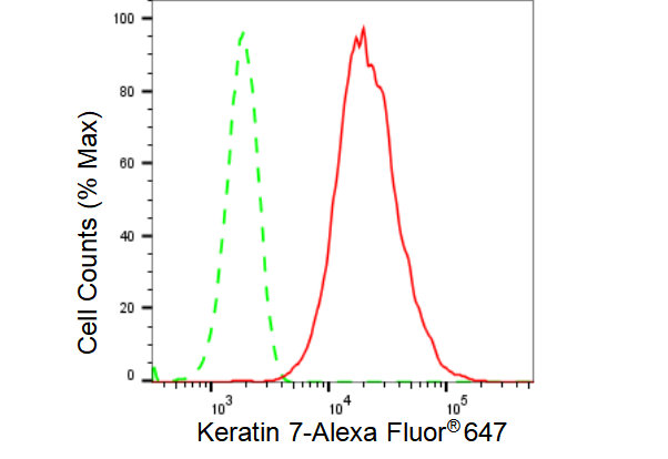 Flow cytometric analysis of Keratin 7 expression in HepG2 cells using Keratin 7 antibody. Green, isotype control; red, Keratin 7.