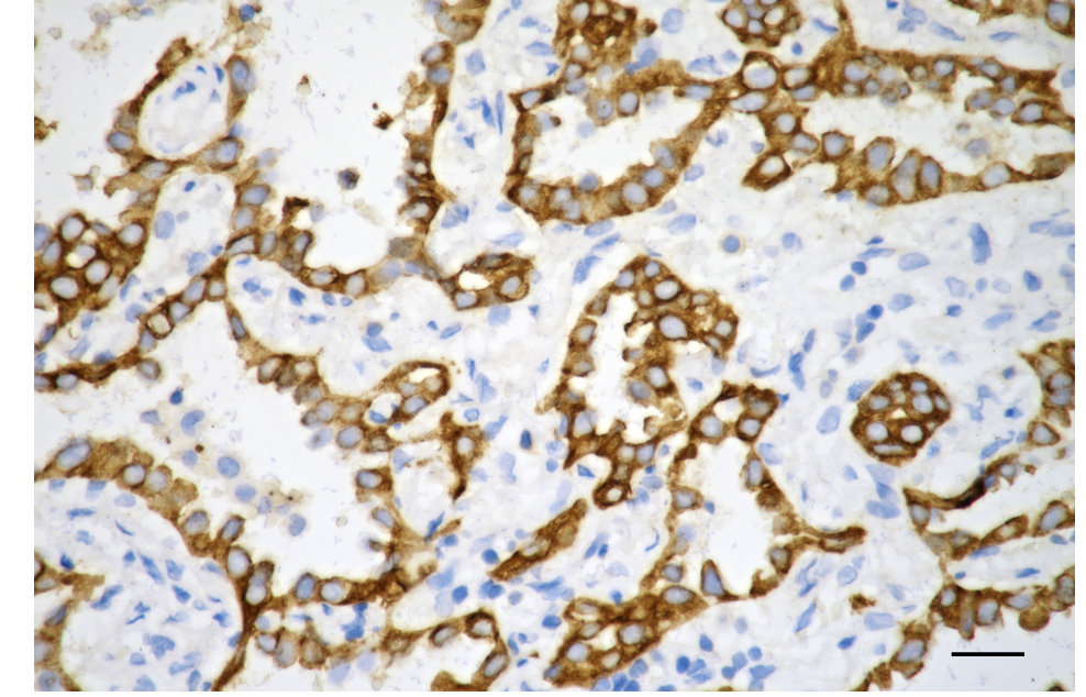 Immunohistochemistry was performed on paraffin-embedded human lung adenocarcinoma using keratin 7 antibody. Antigen retrieval was done in sodium citrate buffer (pH 6.0). DAB was used for detection, with hematoxylin counterstaining. Images were acquired using a Nikon Ci-L Plus microscope (40× objective). Scale bar: 25 μm.