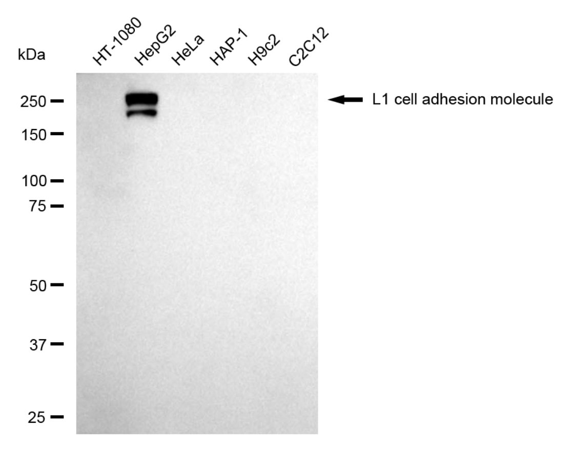 Western blotting analysis using L1 cell adhesion molecule antibody. Total cell lysates (30 μg) from various cell lines were loaded and separated by SDS-PAGE. The blot was incubated with L1 cell adhesion molecule antibody and HRP-conjugated goat anti-rabbit secondary antibody respectively.