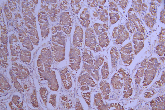 IHC image of CSB-RA907805A0HU diluted at 1:100 and staining in paraffin-embedded human stomach tissue performed on a Leica BondTM system. After dewaxing and hydration, antigen retrieval was mediated by high pressure in a citrate buffer (pH 6.0). Section was blocked with 10% normal goat serum 30min at RT. Then primary antibody (1% BSA) was incubated at 4°C overnight. The primary is detected by a Goat anti-rabbit polymer IgG labeled by HRP and visualized using 0.05% DAB.