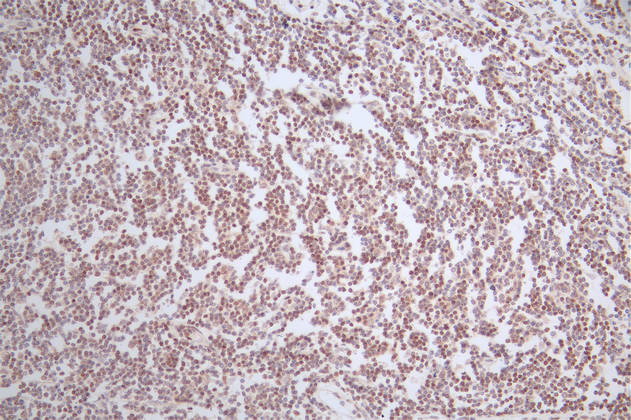 IHC image of CSB-RA561630A0HU diluted at 1:50 and staining in paraffin-embedded human tonsil tissue performed on a Leica BondTM system. After dewaxing and hydration, antigen retrieval was mediated by high pressure in a citrate buffer (pH 6.0). Section was blocked with 10% normal goat serum 30min at RT. Then primary antibody (1% BSA) was incubated at 4°C overnight. The primary is detected by a Goat anti-rabbit polymer IgG labeled by HRP and visualized using 0.52% DAB.