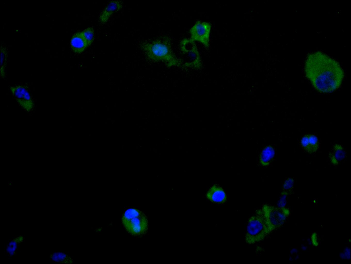 Immunofluorescence staining of HepG2 cell with CSB-RA244970A0HU at 1:50, counter-stained with DAPI. The cells were fixed in 4% formaldehyde, permeabilized using 0.2% Triton X-100 and blocked in 10% normal Goat Serum. The cells were then incubated with the antibody overnight at 4°C. The secondary antibody was Alexa Fluor 488-congugated AffiniPure Goat Anti-Rabbit IgG(H+L).