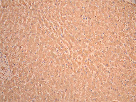 IHC image of CSB-RA847747MA2HU diluted at 1:50 and staining in paraffin-embedded human liver tissue performed on a Leica BondTM system. After dewaxing and hydration, antigen retrieval was mediated by high pressure in a citrate buffer (pH 6.0). Section was blocked with 10% normal goat serum 30min at RT. Then primary antibody (1% BSA) was incubated at 4°C overnight. The primary is detected by a Anti-Human lgG, Fcy Fragment Specific labeled by HRP and visualized using 0.05% DAB.