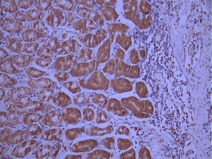 IHC image of CSB-RA579236A0HU diluted at 1:100 and staining in paraffin-embedded human gastric cancer performed on a Leica BondTM system. After dewaxing and hydration, antigen retrieval was mediated by high pressure in a citrate buffer (pH 6.0). Section was blocked with 10% normal goat serum 30min at RT. Then primary antibody (1% BSA) was incubated at 4°C overnight. The primary is detected by a Goat anti-rabbit polymer IgG labeled by HRP and visualized using 0.05% DAB.