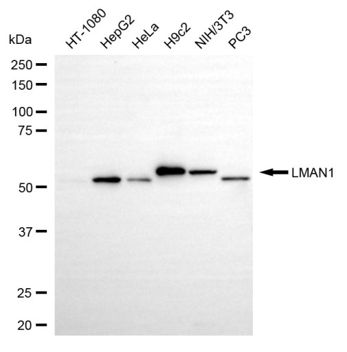 Western blotting analysis using LMAN1 antibody. Total cell lysates (30 μg) from various cell lines were loaded and separated by SDS-PAGE. The blot was incubated with LMAN1 antibody and HRP-conjugated goat anti-rabbit secondary antibody respectively.