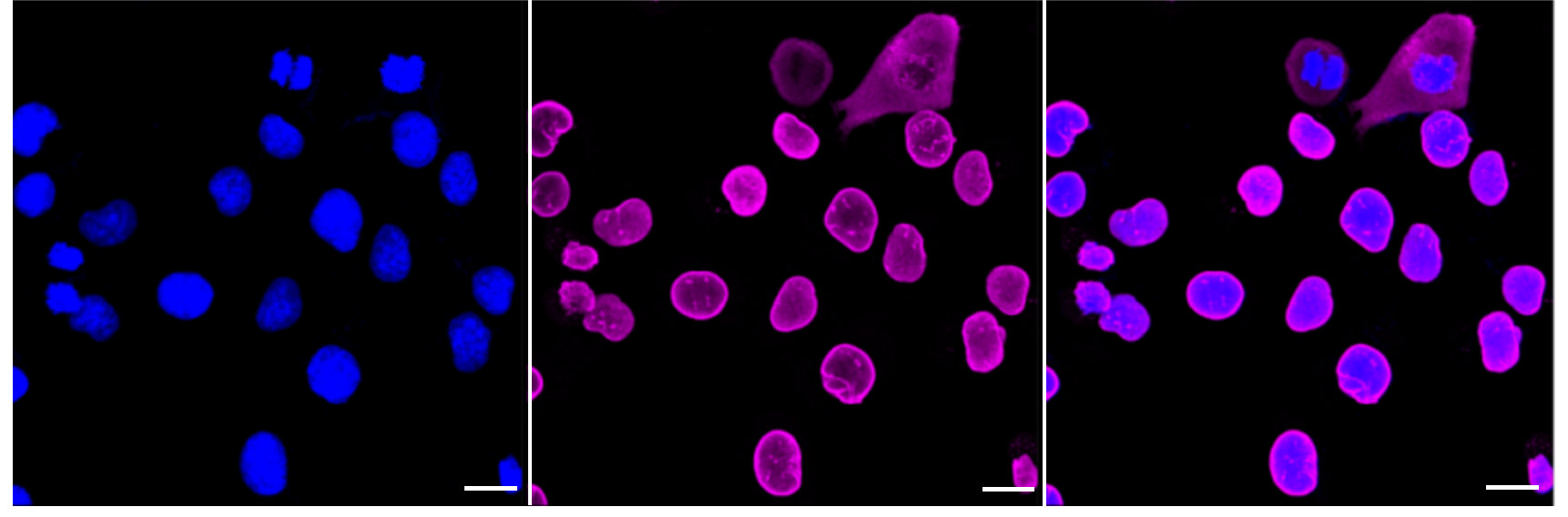 Immunocytochemical staining of HT-1080 cells with Lamin A/C antibody. Nuclei were stained blue with DAPI; Lamin A/C was stained magenta with Alexa Fluor? 647. Images were taken using leica stellaris 5. Protein abundance based on laser intensity and smart gain: High. Scale bar: 20 μm.