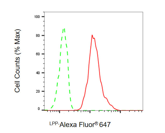 Flow cytometric analysis of LPP expression in HT-1080 cells using LPP antibody. Green, isotype control; red, LPP.