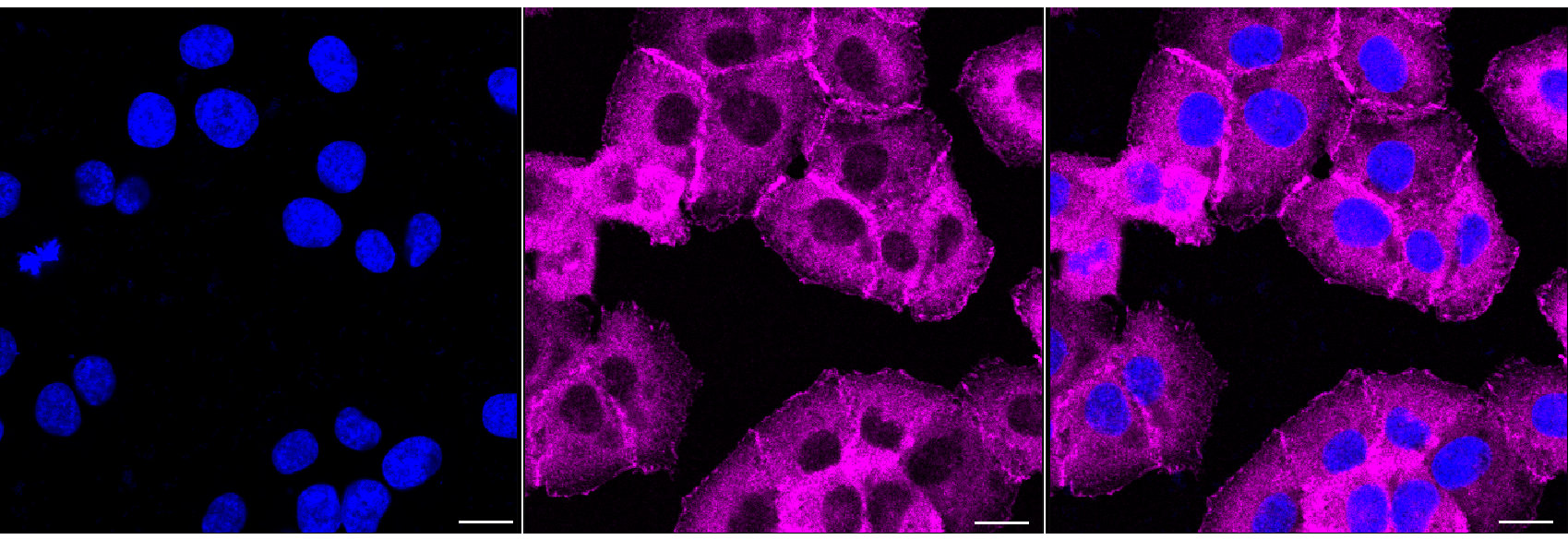 Immunocytochemical staining of HT-1080 cells with LPP antibody. Nuclei were stained blue with DAPI; LPP was stained magenta with Alexa Fluor? 647. Images were taken using Leica stellaris 5. Protein abundance based on laser Intensity and smart gain: Medium. Scale bar, 20 μm.