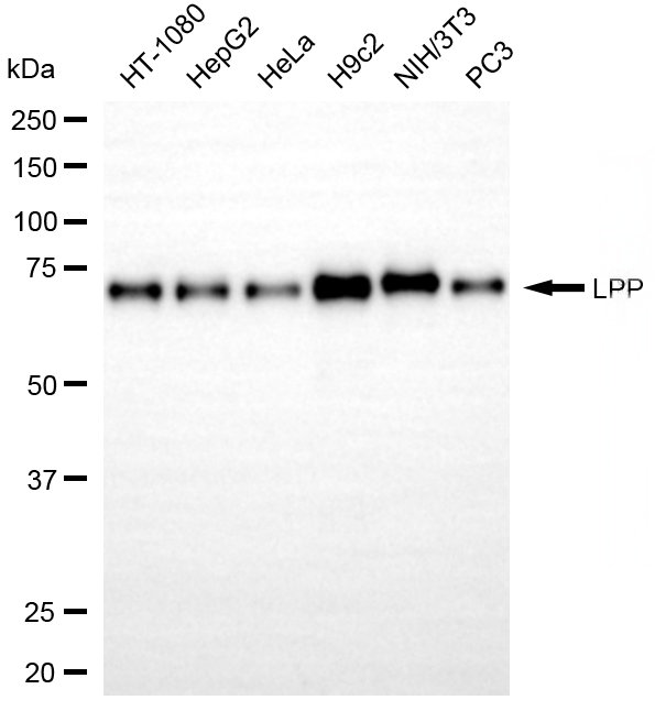 Western blotting analysis using LPP antibody. Total cell lysates (20 μg) from various cell lines were loaded and separated by SDS-PAGE. The blot was incubated with LPP antibody and HRP-conjugated goat anti-rabbit secondary antibody respectively.