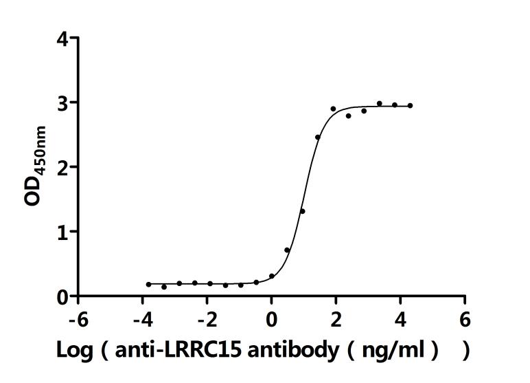 Activity: Measured by its binding ability in a functional ELISA. Immobilized Human LRRC15 (CSB-MP819484HU) at 2 μg/mL on an Nickel Coated plate can bind Anti-LRRC15 recombinant antibody. The EC50 is 12.18-15.75 ng/mL.