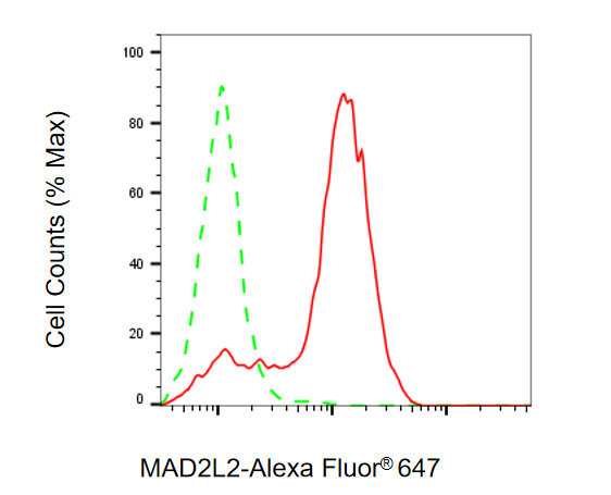 Flow cytometric analysis of MAD2L2 expression in HAP-1 cells using MAD2L2 antibody. Green, isotype control; red, MAD2L2.