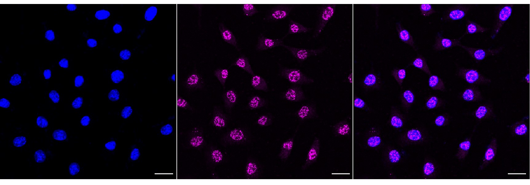 Immunocytochemical staining of C2C12 cells with Phospho-MEK1 (T292) antibody. Nuclei were stained blue with DAPI; Phospho-MEK1 (T292) was stained magenta with Alexa Fluor? 647. Images were taken using Leica stellaris 5. Protein abundance based on laser Intensity and smart gain: Medium. Scale bar, 20 μm.