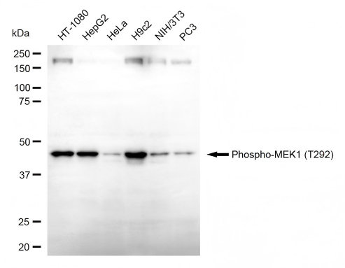 Western blotting analysis using phospho-MEK1 (T292) antibody. Total cell lysates (30 μg) from various cell lines were loaded and separated by SDS-PAGE. The blot was incubated with phospho-MEK1 (T292) antibody and HRP-conjugated goat anti-rabbit secondary antibody respectively.