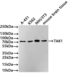 Positive WB detected in: A431 whole cell lysate(30μg), K562 whole cell lysate(30μg), NIH/3T3 whole cell lysate(30μg), Mouse brain tissue lysate(30μg)