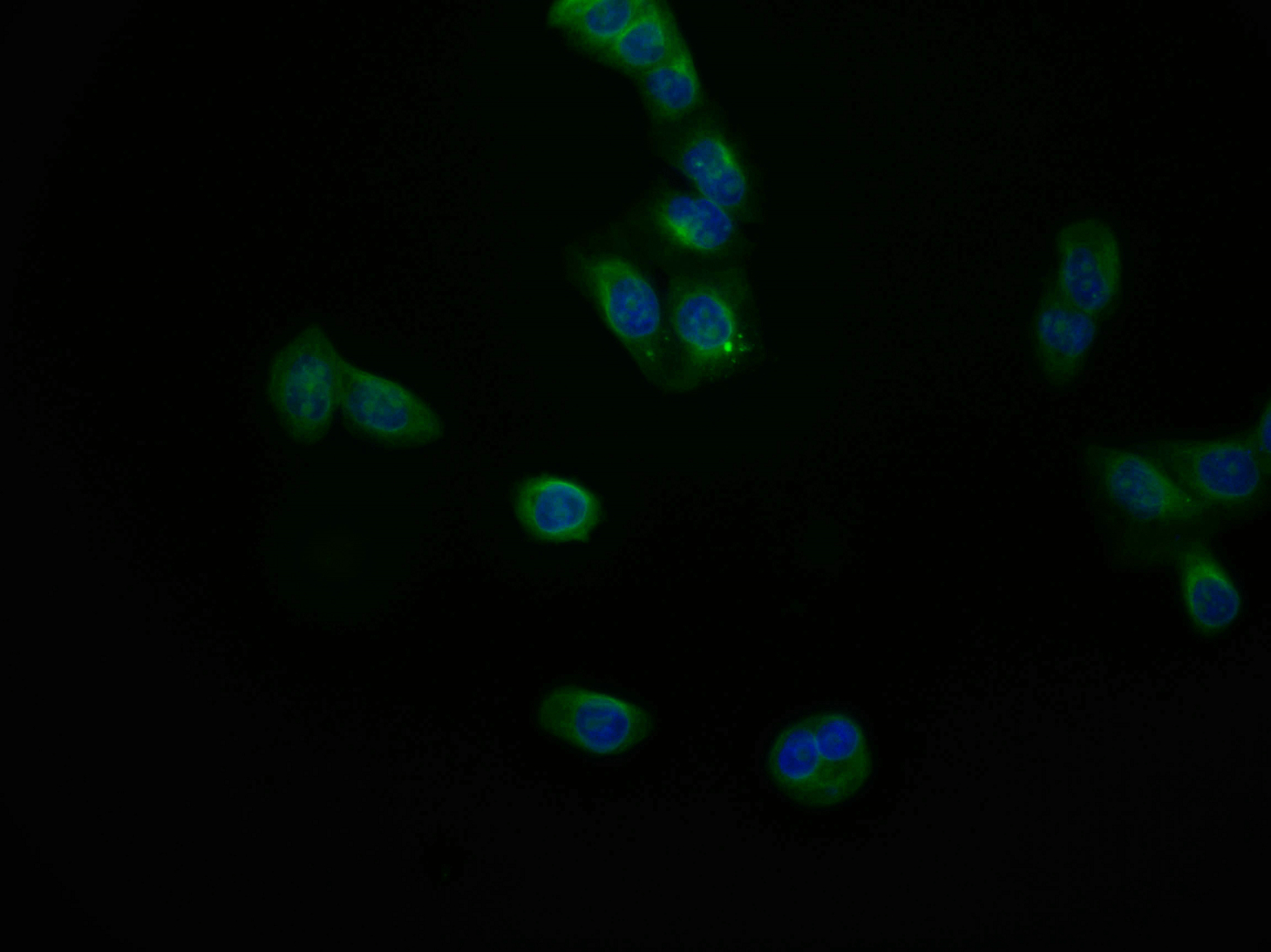 Immunofluorescence staining of PC-3 cell with CSB-RA240216A0HU at 1:50, counter-stained with DAPI. The cells were fixed in 4% formaldehyde and blocked in 10% normal Goat Serum. The cells were then incubated with the antibody overnight at 4°C. The secondary antibody was Alexa Fluor 553-congugated AffiniPure Goat Anti-Rabbit IgG(H+L).