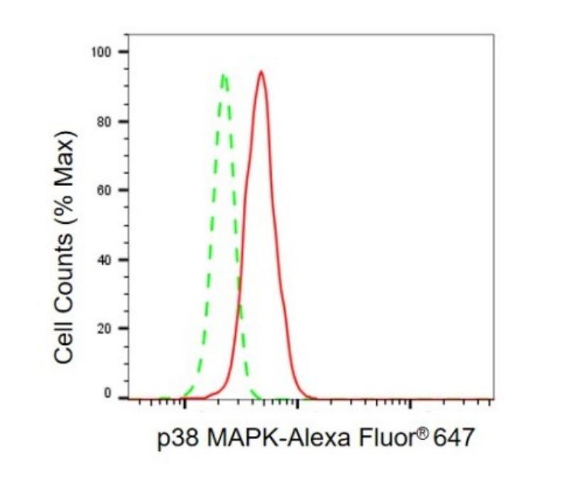 Flow cytometric analysis of p38 MAPK expression in HeLa cells using p38 MAPK antibody. Green, isotype control; red, p38 MAPK.