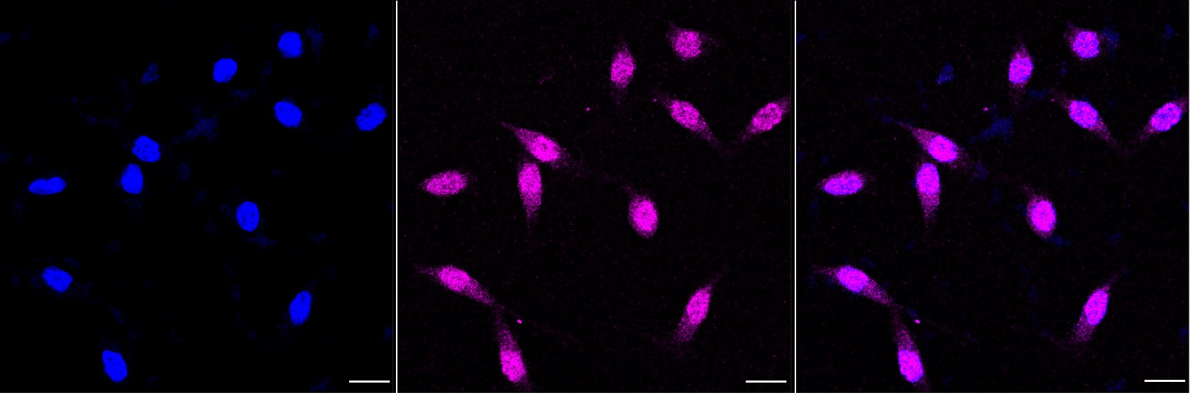 Immunocytochemical staining of Hela cells with p38 MAPK antibody. Nuclei were stained blue with DAPI; p38 MAPK was stained magenta with Alexa Fluor? 647. Images were taken using Leica stellaris 5. Protein abundance based on laser Intensity and smart gain: Medium. Scale bar, 20 μm.