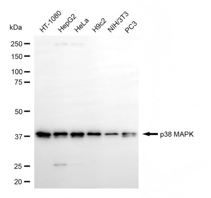 Western blotting analysis using p38 MAPK antibody. Total cell lysates (30 μg) from various cell lines were loaded and separated by SDS-PAGE. The blot was incubated with p38 MAPK antibody and HRP-conjugated goat anti-rabbit secondary antibody respectively.