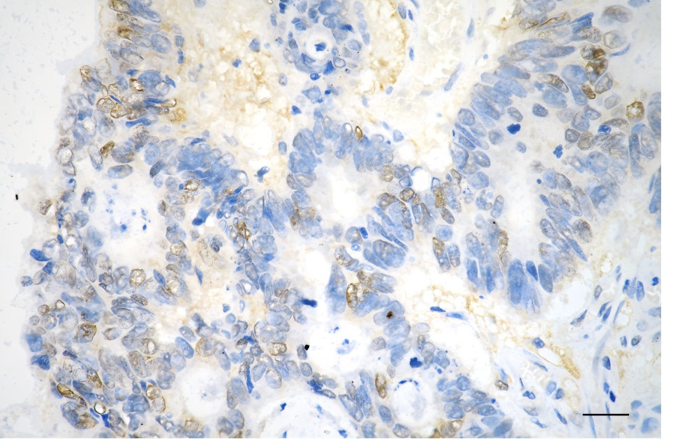 Immunohistochemistry was performed on paraffin-embedded human sigmoid colon carcinoma using ERK1 antibody. Antigen retrieval was done in sodium citrate buffer (pH 6.0). DAB was used for detection, with hematoxylin counterstaining. Images were acquired using a Nikon Ci-L Plus microscope (40× objective). Scale bar: 25 μm.