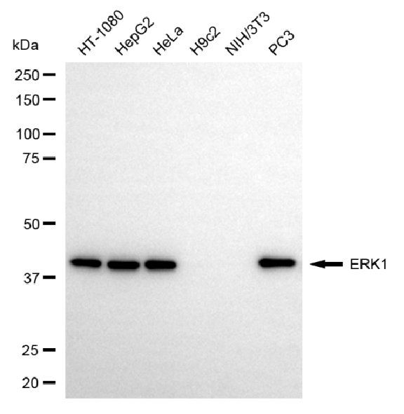 Western blotting analysis using ERK1 antibody. Total cell lysates (30 μg) from various cell lines were loaded and separated by SDS-PAGE. The blot was incubated with ERK1 antibody and HRP-conjugated goat anti-rabbit secondary antibody respectively.