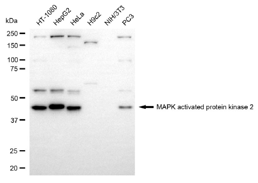 Western blotting analysis using MAPK activated protein kinase 2 antibody. Total cell lysates (30 μg) from various cell lines were loaded and separated by SDS-PAGE. The blot was incubated with MAPK activated protein kinase 2 antibody and HRP-conjugated goat anti-rabbit secondary antibody respectively.