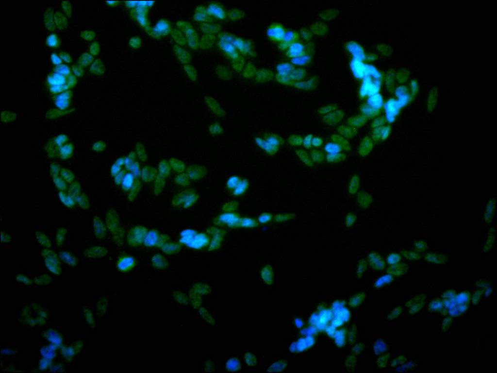 Immunofluorescence staining of SH-SY5Y cell with CSB-RA221924A0HU at 1:50, counter-stained with DAPI. The cells were fixed in 4% formaldehyde, permeabilized using 0.2% Triton X-100 and blocked in 10% normal Goat Serum. The cells were then incubated with the antibody overnight at 4°C. The secondary antibody was Alexa Fluor 488-congugated AffiniPure Goat Anti-Rabbit IgG(H+L).