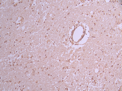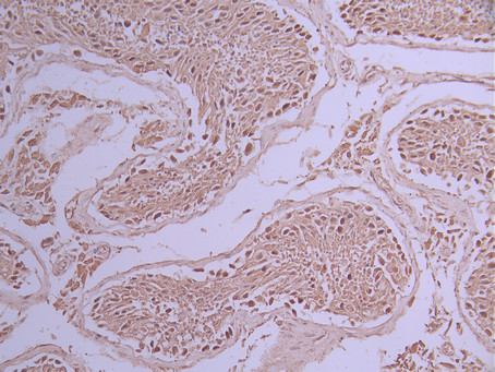 IHC image of CSB-RA221924A0HU diluted at 1:100 and staining in paraffin-embedded human glioma cancer performed on a Leica BondTM system. After dewaxing and hydration, antigen retrieval was mediated by high pressure in a citrate buffer (pH 6.0). Section was blocked with 10% normal goat serum 30min at RT. Then primary antibody (1% BSA) was incubated at 4°C overnight. The primary is detected by a Goat anti-rabbit polymer IgG labeled by HRP and visualized using 0.05% DAB.