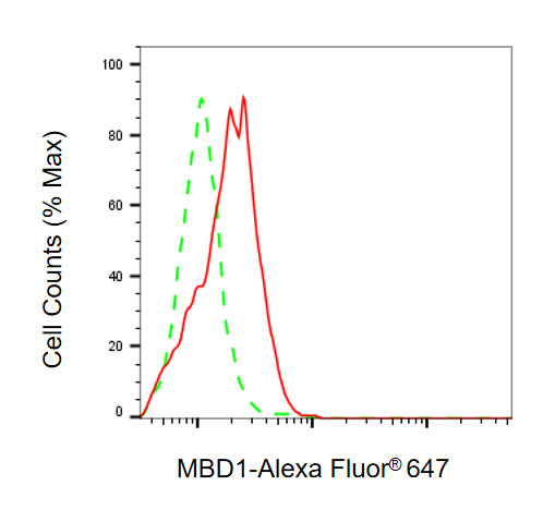 Flow cytometric analysis of MBD1 expression in HAP-1 cells using MBD1 antibody. Green, isotype control; red, MBD1.