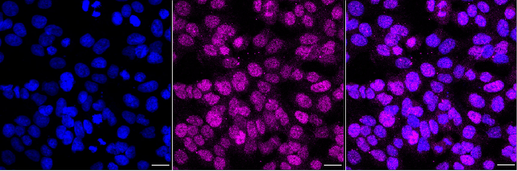 Immunocytochemical staining of HAP1 cells with MBD1 antibody. Nuclei were stained blue with DAPI; MBD1 was stained magenta with Alexa Fluor? 647. Images were taken using Leica stellaris 5. Protein abundance based on laser Intensity and smart gain: Low. Scale bar, 20 μm.