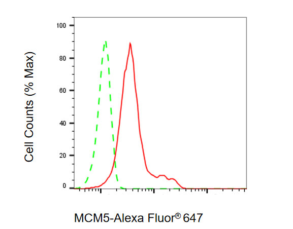Flow cytometric analysis of MCM5 expression in HepG2 cells using MCM5 antibody. Green, isotype control; red, MCM5.