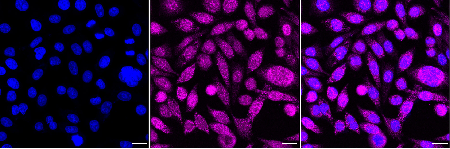 Immunocytochemical staining of HepG2 cells with MCM5 antibody. Nuclei were stained blue with DAPI; MCM5 was stained magenta with Alexa Fluor? 647. Images were taken using Leica stellaris 5. Protein abundance based on laser Intensity and smart gain: Medium. Scale bar, 20 μm.