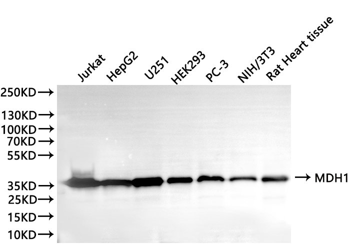 , Positive WB detected in:Jurkat whole cell lysate(30μg), HepG2 whole cell lysate(30μg), U251 whole cell lysate(30μg), HEK293 whole cell lysate(30μg), PC-3 whole cell lysate(30μg), NIH/3T3 whole cell lysate(30μg), Rat heart lysate(30μg)