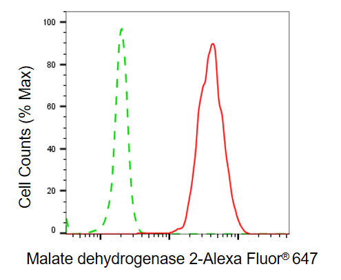 Flow cytometric analysis of malate dehydrogenase 2 expression in C2C12 cells using malate dehydrogenase 2 antibody. Green, isotype control; red, malate dehydrogenase 2.