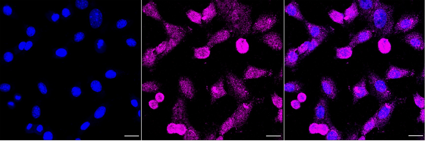 Immunocytochemical staining of C2C12 cells with Malate dehydrogenase 2 antibody. Nuclei were stained blue with DAPI; Malate dehydrogenase 2 was stained magenta with Alexa Fluor? 647. Images were taken using Leica stellaris 5. Protein abundance based on laser Intensity and smart gain: Low. Scale bar, 20 μm.