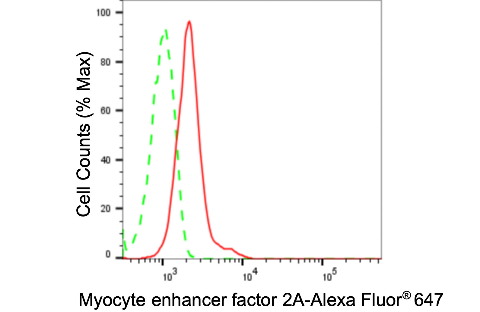 Flow cytometric analysis of Myocyte enhancer factor 2A expression in HepG2 cells using Myocyte enhancer factor 2A antibody. Green, isotype control; red, Myocyte enhancer factor 2A.