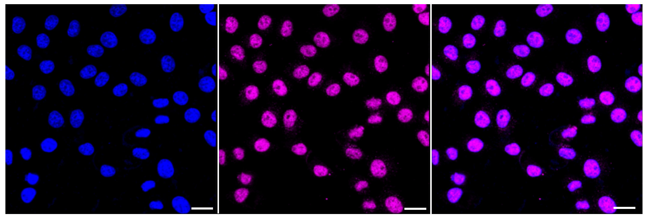 Immunocytochemical staining of HepG2 cells with Menin 1 antibody. Nuclei were stained blue with DAPI; Menin 1 was stained magenta with Alexa Fluor? 647. Images were taken using Leica stellaris 5. Protein abundance based on laser Intensity and smart gain: Medium. Scale bar: 20 μm.