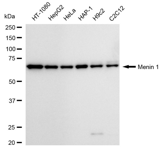 Western blotting analysis using Menin 1 antibody. Total cell lysates (30 μg) from various cell lines were loaded and separated by SDS-PAGE. The blot was incubated with Menin 1 antibody and HRP-conjugated goat anti-rabbit secondary antibody respectively.