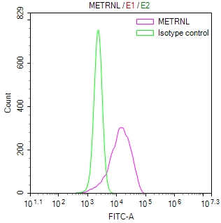 Overlay Peak curve showing Hela cells stained with CSB-RA731035MA1HU (red line) at 1:100. The cells were fixed in 4% formaldehyde and permeated by 0.2% TritonX-100 for 10min. Then 10% normal goat serum to block non-specific protein-protein interactions followed by the antibody (1ug/1*106cells) for 45min at 4℃. The secondary antibody used was Fluorescein (FITC) AffiniPure Goat Anti-Human IgG, Fcγ fragment specific at 1:200 dilution for 35 min at 4℃.Control antibody (green line) was human IgG1 (1ug/1*106cells) used under the same conditions. Acquisition of >10,000 events was performed.