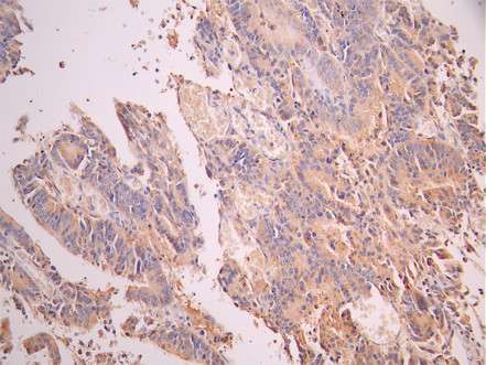 IHC image of CSB-RA644692A0HU diluted at 1:100 and staining in paraffin-embedded human colorectal cancer performed on a Leica BondTM system. After dewaxing and hydration, antigen retrieval was mediated by high pressure in a citrate buffer (pH 6.0). Section was blocked with 10% normal goat serum 30min at RT. Then primary antibody (1% BSA) was incubated at 4°C overnight. The primary is detected by a Goat anti-rabbit polymer IgG labeled by HRP and visualized using 0.05% DAB.
