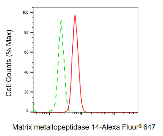 Flow cytometric analysis of matrix metallopeptidase 14 expression in HAP-1 cells using matrix metallopeptidase 14 antibody. Green, isotype control; red, matrix metallopeptidase 14.