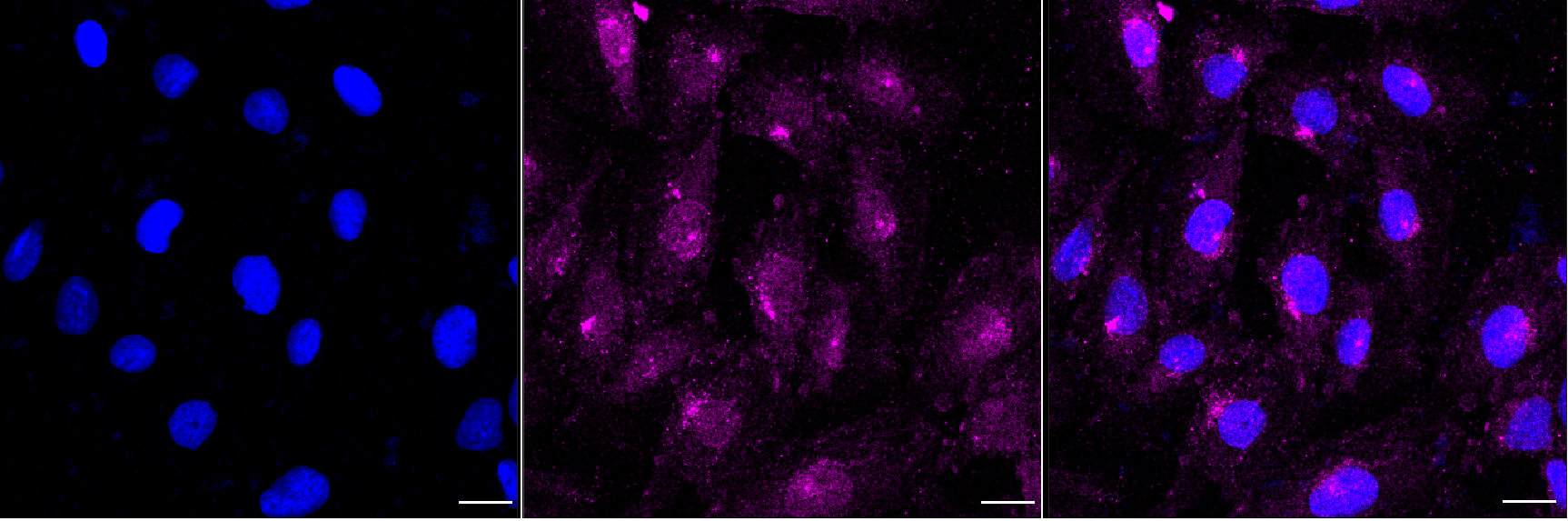 Immunocytochemical staining of H9C2 cells with matrix metallopeptidase 14 antibody. Nuclei were stained blue with DAPI; Matrix metallopeptidase 14 was stained magenta with Alexa Fluor? 647. Images were taken using Leica stellaris 5. Protein abundance based on laser Intensity and smart gain: Medium. Scale bar, 20 μm.