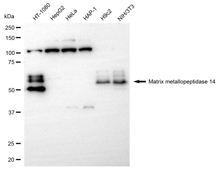 Western blotting analysis using matrix metallopeptidase 14 antibody. Total cell lysates (30 μg) from various cell lines were loaded and separated by SDS-PAGE. The blot was incubated with matrix metallopeptidase 14 antibody and HRP-conjugated goat anti-rabbit secondary antibody respectively.