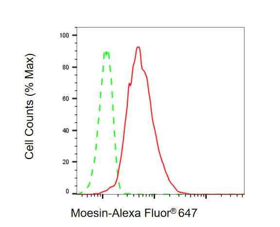 Flow cytometric analysis of Moesin expression in HepG2 cells using Moesin antibody. Green, isotype control; red, Moesin.